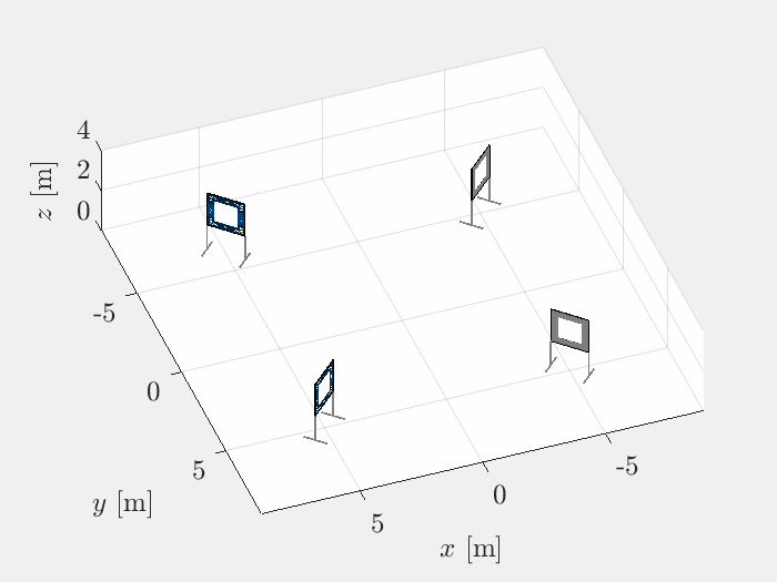 The simulation environment of the racing track with racing gates is implemented in MATLAB and tested in MATLAB R2020b. A sample environment is shown in Figure 3. The latest version of the simulation environment can be downloaded from GitHub repository. The simulation package contains five files: